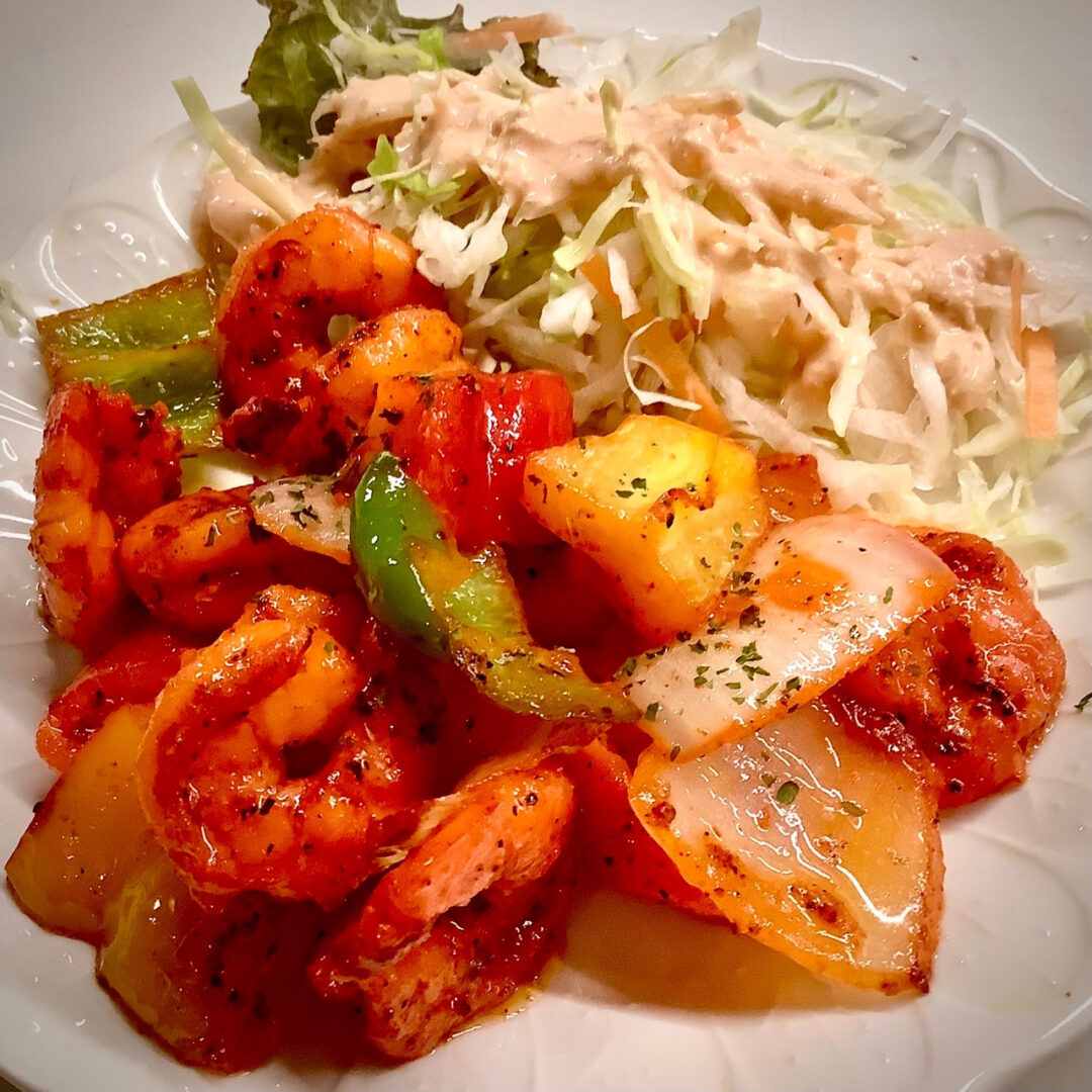 スパイスが効いたプリプリエビと、クリーミーなじゃがいもサラダがワンプレートに